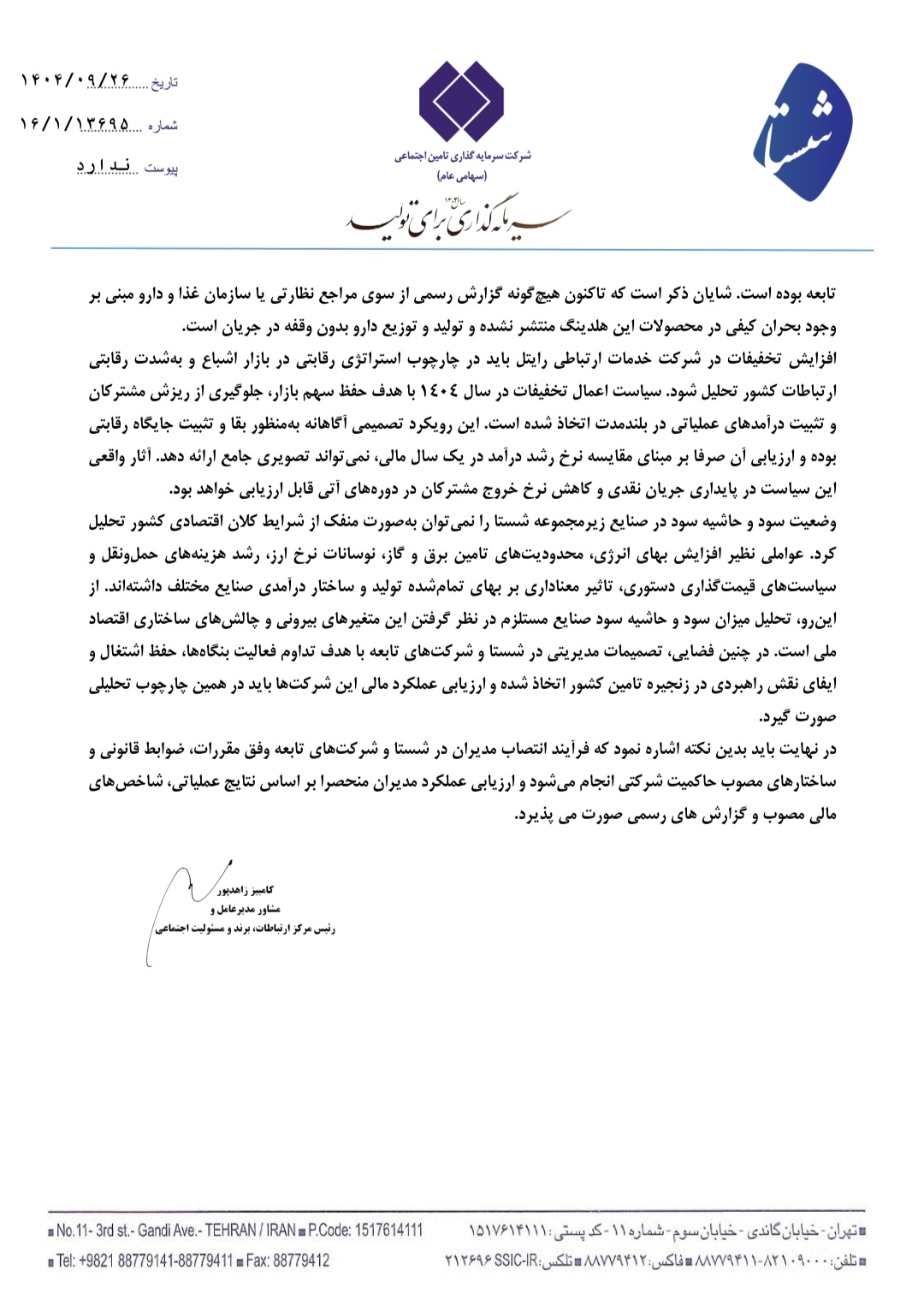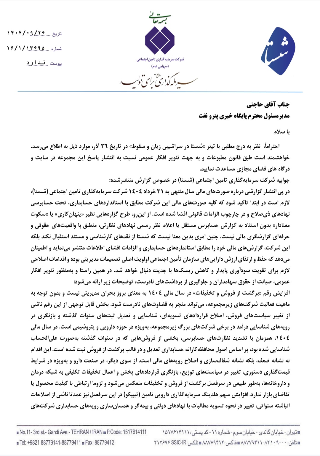 جوابیه شرکت سرمایه گذاری تامین اجتماعی(شستا )