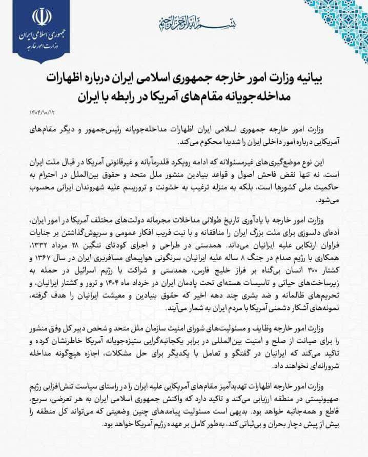 وزارت امور خارجه با یادآوری تاریخ طولانی مداخلات مجرمانه دولتهای مختلف آمریکا در امور ایران، ادعای دلسوزی برای ملت بزرگ ایران را منافقانه و با نیت فریب افکار عمومی و سرپوشگذاشتن بر جنایات فراوان ارتکابی علیه ایرانیان میداند. همدستی در طراحی و اجرای کودتای ننگین 28 مرداد 1332، همکاری با رژیم صدام در جنگ 8 ساله علیه ایرانیان، سرنگونی هواپیمای مسافربری ایران در سال 1367 و کشتار 300 انسان بیگناه بر فراز خلیج فارس، همدستی و شراکت با رژیم اسرائیل در حمله به زیرساختهای حیاتی و تاسیسات هستهای تحت پادمان ایران در خرداد ماه 1404 و ترور و کشتار ایرانیان، و تحریمهای ظالمانه و ضد بشری چند دهه اخیر که حقوق بنیادین و معیشت ایرانیان را هدف گرفته، نمونههای آشکار دشمنی آمریکا با مردم ایران به شمار میآیند.