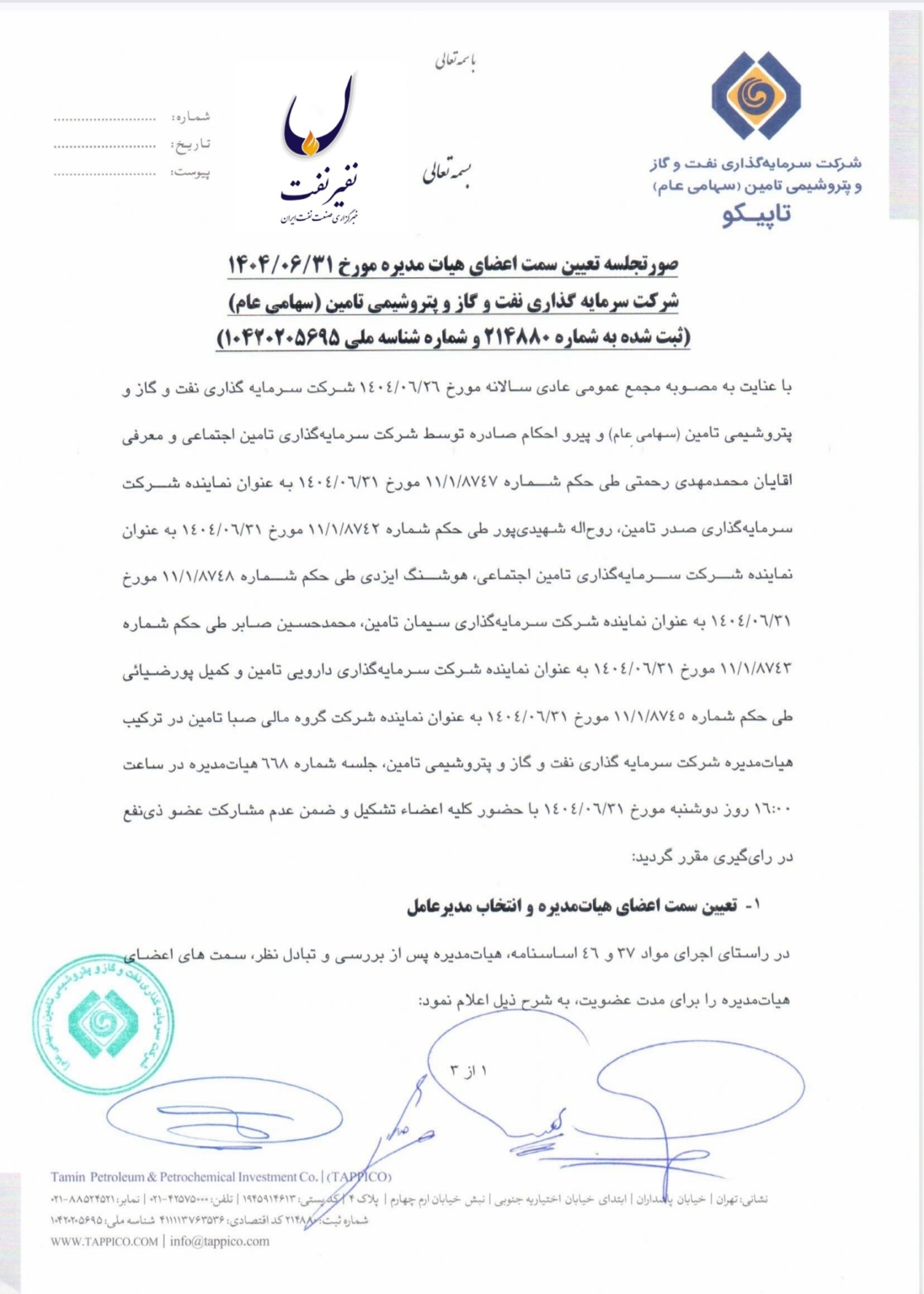 به گزارش پترونفت، جلسه هیاتمدیره این شرکت روز دوشنبه ۳۱ شهریور ۱۴۰۴ با حضور تمامی اعضا برگزار شد و طی آن، سمتهای اعضای هیاتمدیره و مدیرعامل مشخص گردید.