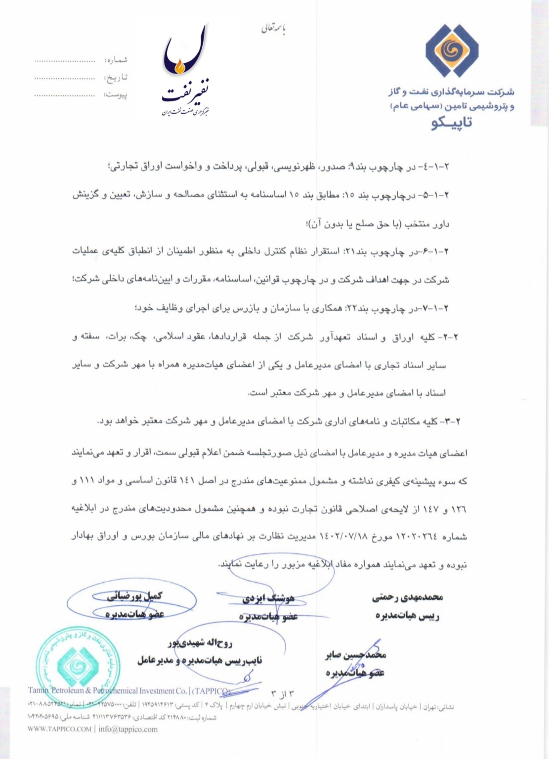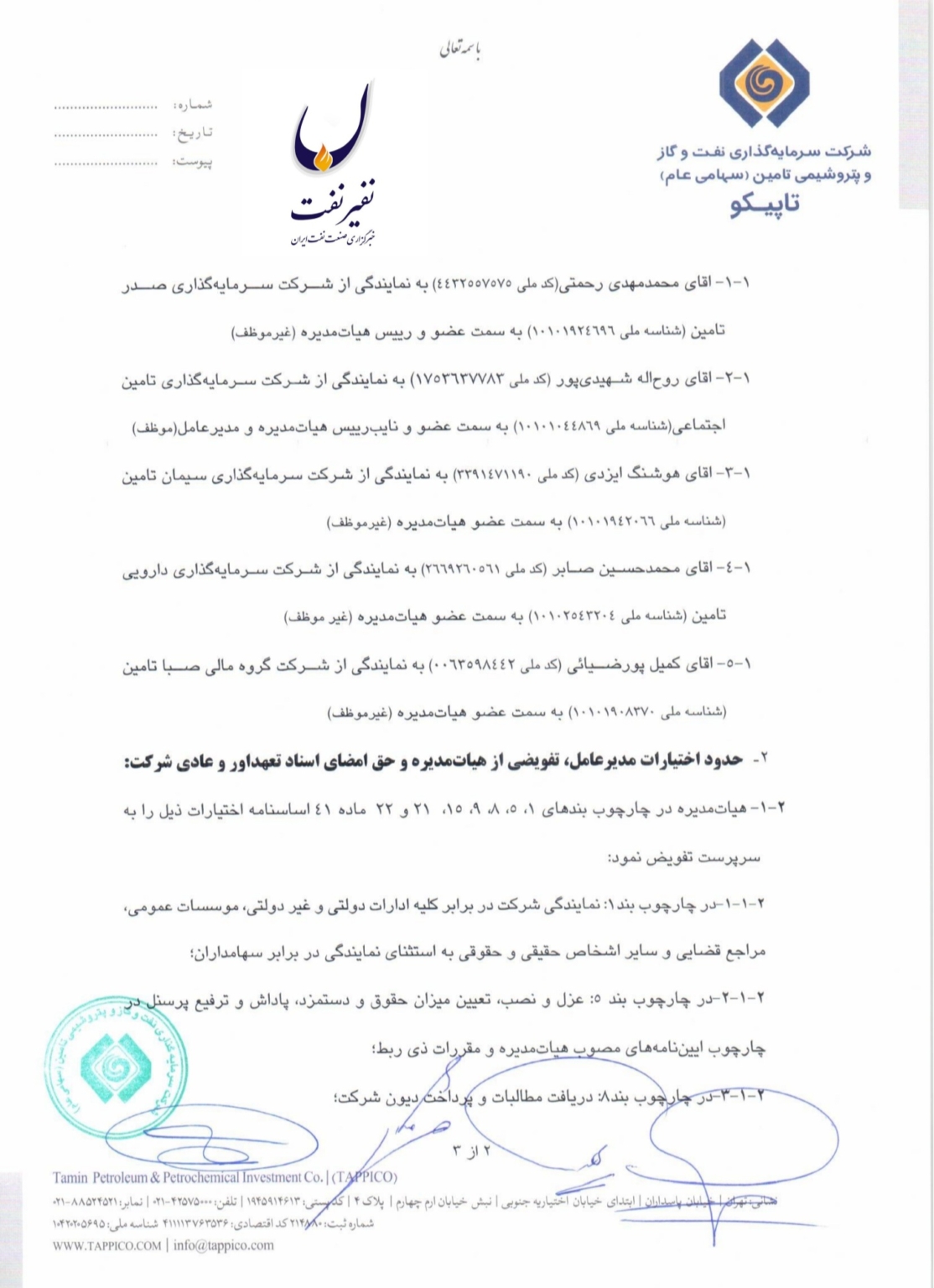همچنین مقرر شد که کلیه اسناد تعهدآور شرکت از جمله قراردادها، عقود اسلامی، چک، برات و سفته صرفاً با امضای مدیرعامل به همراه یکی از اعضای هیاتمدیره و مهر شرکت معتبر باشد. مکاتبات اداری نیز تنها با امضای مدیرعامل و مهر شرکت رسمیت خواهد یافت.