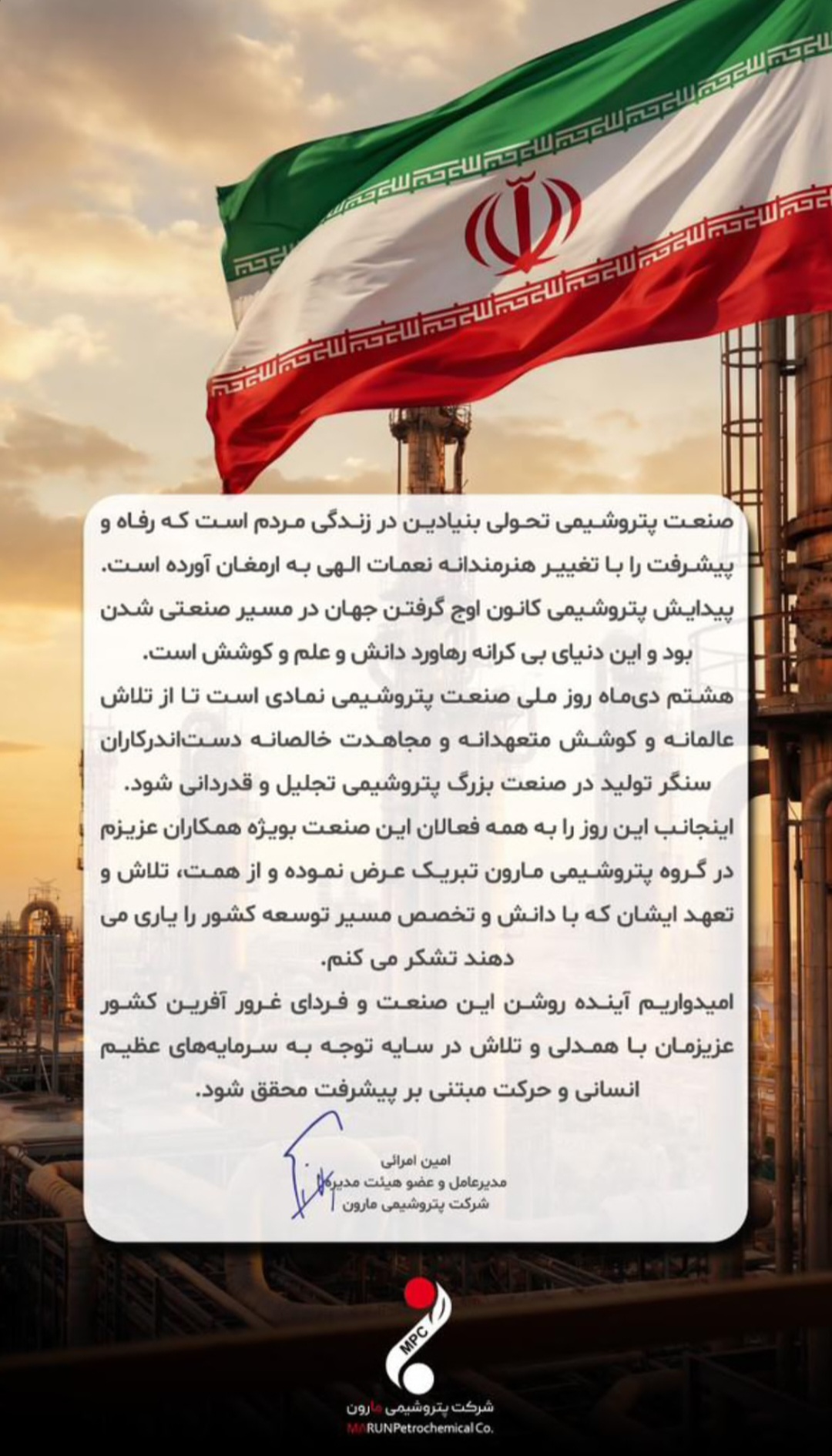 پیام امین امرائی، مدیرعامل شرکت پتروشیمی مارون به مناسبت ۸ دی ماه روز صنعت پتروشیمی