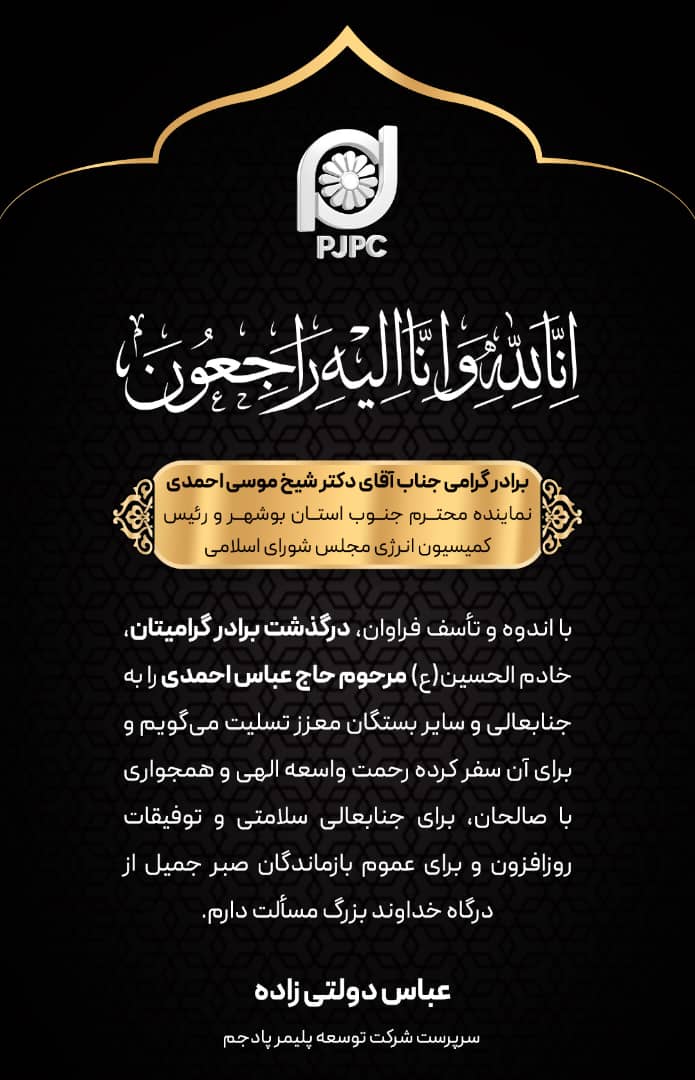 با اندوه و تأسف فراوان، درگذشت برادر گرامیتان، خادم الحسین(ع) مرحوم حاج عباس احمدی را به جنابعالی و سایر بستگان معزز تسلیت میگویم و برای آن سفر کرده رحمت واسعه الهی و همجواری با صالحان، برای جنابعالی سلامتی و توفیقات روزافزون و برای عموم بازماندگان صبر جمیل از درگاه خداوند بزرگ مسألت دارم.