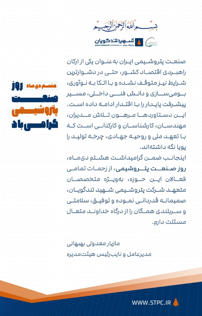 پیام مهندس مازیار معدولی مدیرعامل پتروشیمی شهید تندگویان به مناسبت روز صنعت پتروشیمی